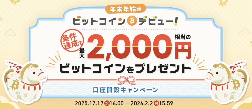 BITPOINTでは、口座開設が完了し、1,000円以上の暗号資産購入で、合計2,000円相当のビットコインがもらえるキャンペーン実施中!(※口座開設完了のみの場合は、1,000円相当のビットコインをプレゼント。)